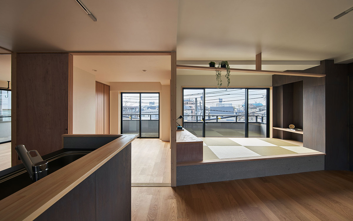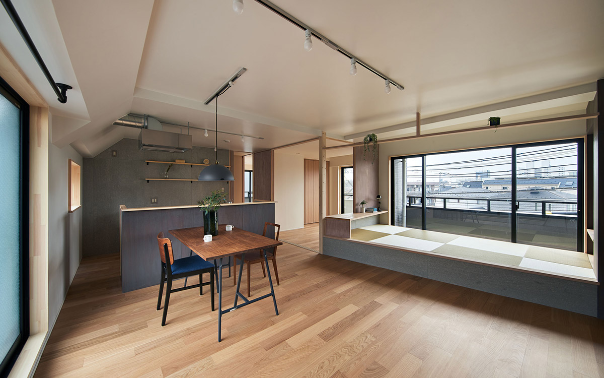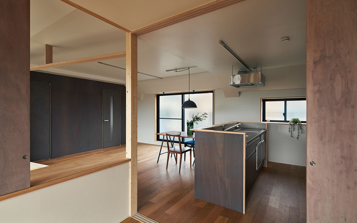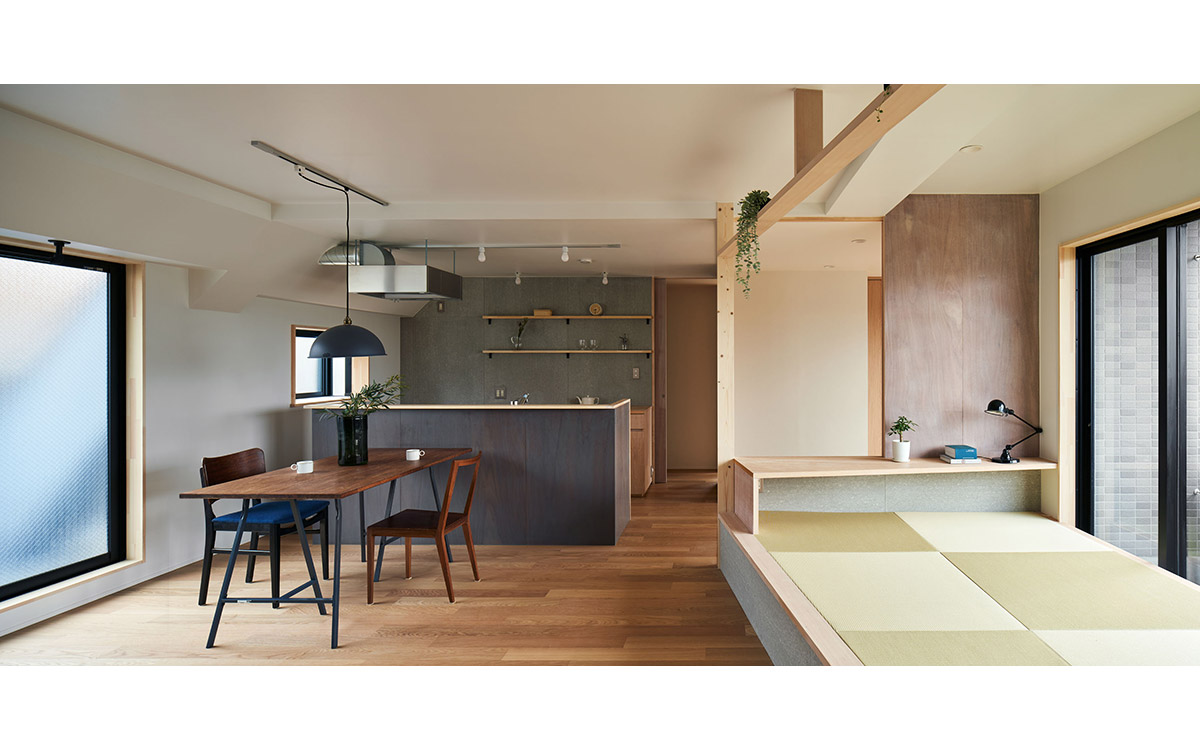細かく区切られていた既存の2LDKを解体し、家具・建具と床や天井のレベル差で緩やかに領域を分ける一室空間プランを再構築した。既存南面窓からの自然採光通風を住居全体へ行き渡らせ、高性能断熱ボードを天井と壁に張り込むことによって温熱環境と快適性の向上を図っている。こうした装いの抜本的な一新によって、光や風と家族の気配を感じながら暮らせる伸びやかな住まいを実現させた。