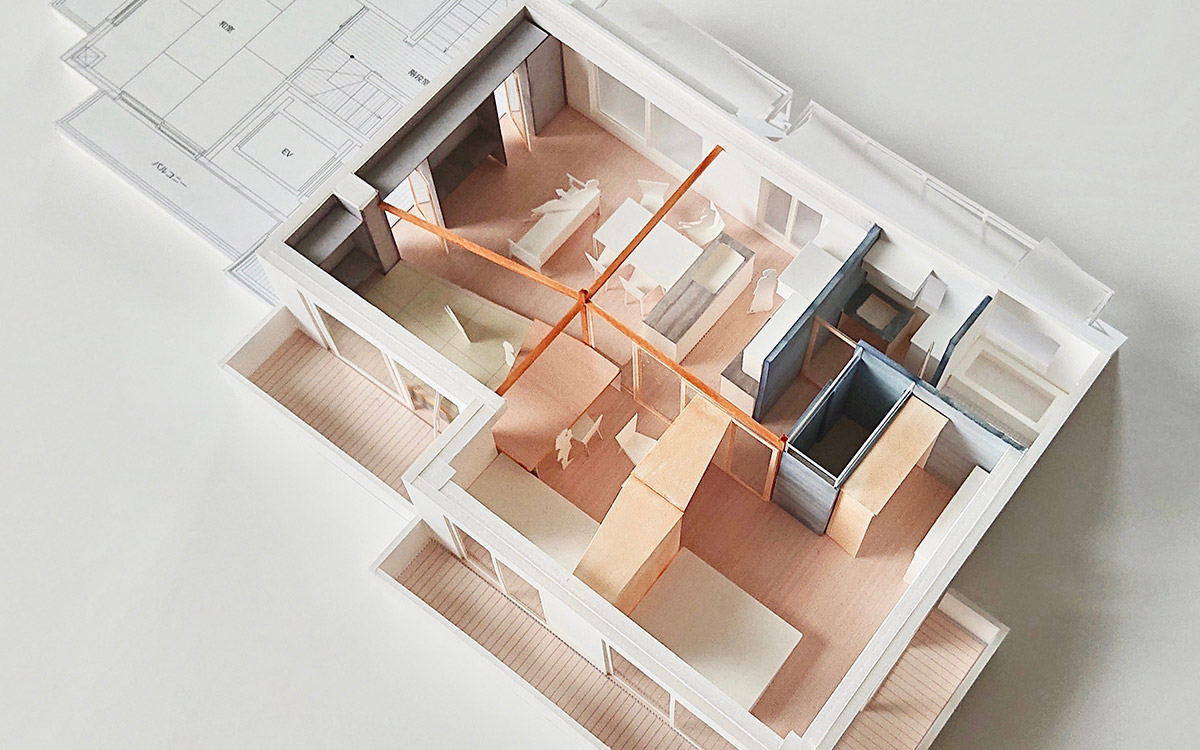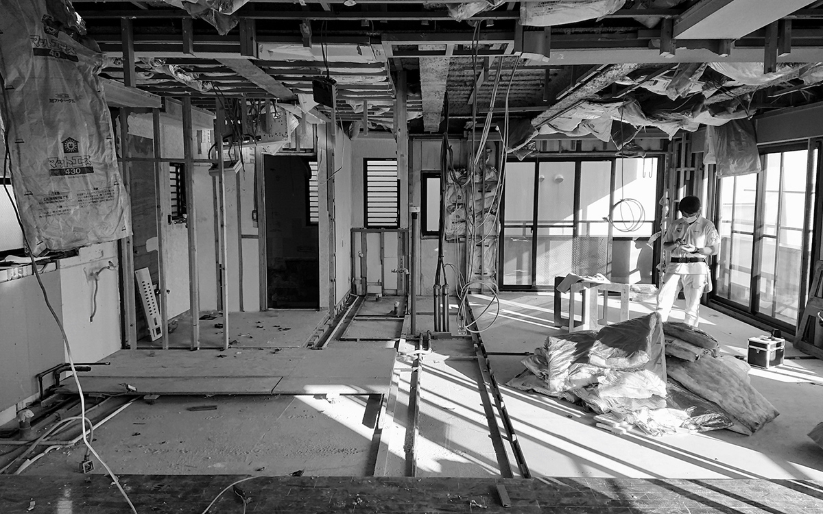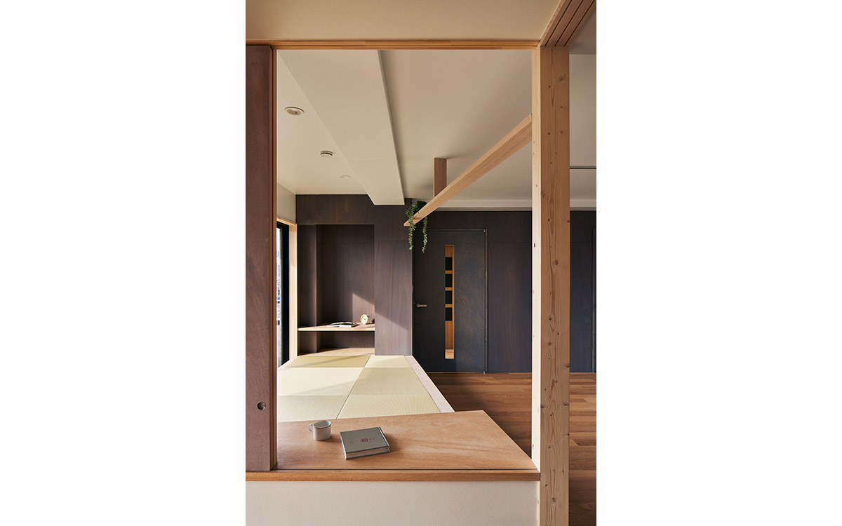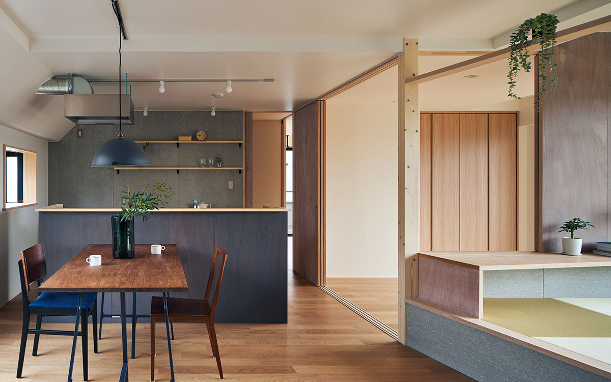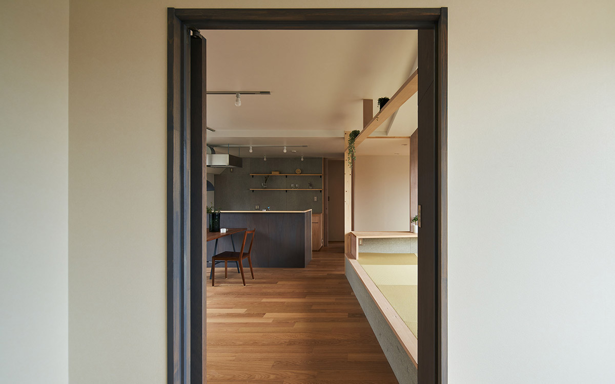 細かく区切られていた既存の2LDKを解体し、家具・建具と床や天井のレベル差で緩やかに領域を分ける一室空間プランを再構築した。既存南面窓からの自然採光通風を住居全体へ行き渡らせ、高性能断熱ボードを天井と壁に張り込むことによって温熱環境と快適性の向上を図っている。こうした装いの抜本的な一新によって、光や風と家族の気配を感じながら暮らせる伸びやかな住まいを実現させた。