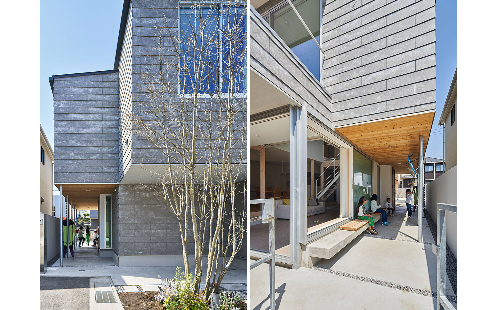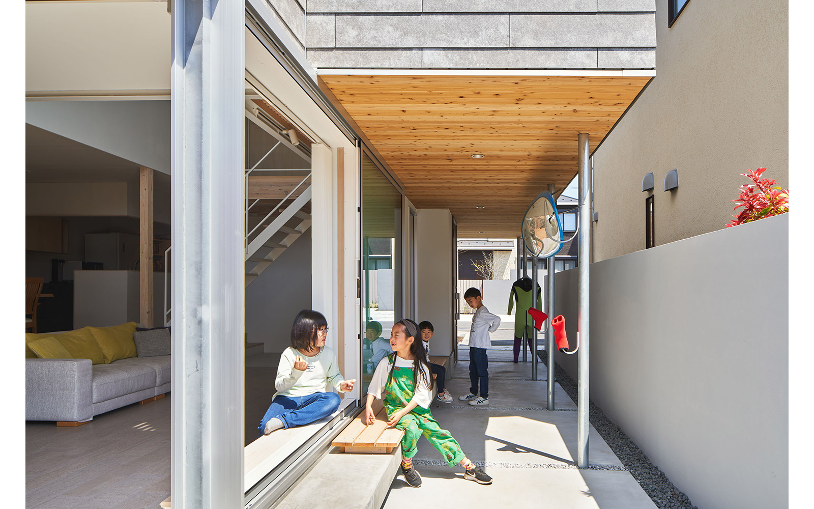 竣工後に訪れてみると「通りdoma」は近隣の子供達の遊び場や抜け道となっているようで、日光や海風を透過しながら暮らしが生き生きと滲み出る様子が伺えた。また、隣家も2面道路を接続する敷地内通路を新たに設けることになったようだ。