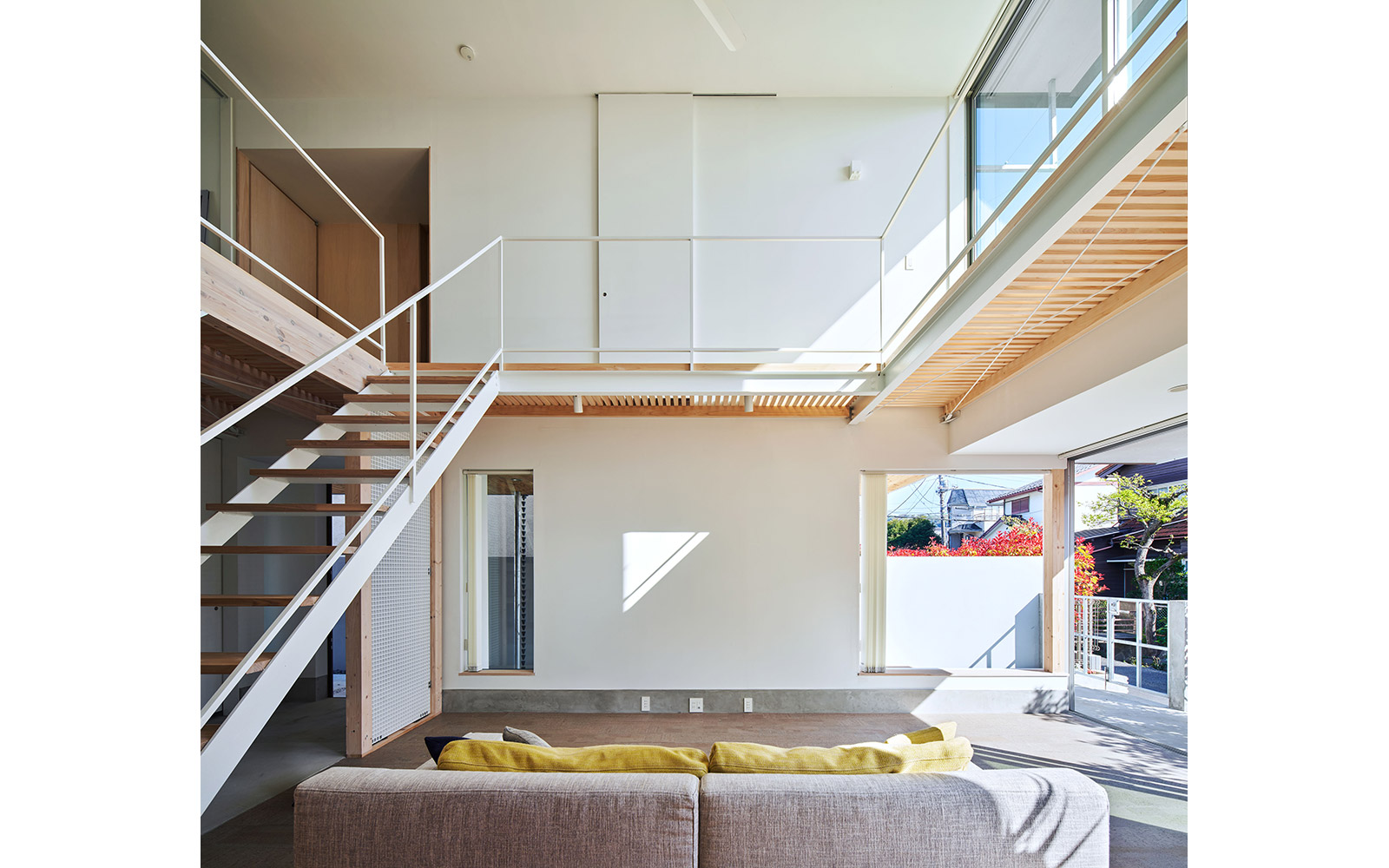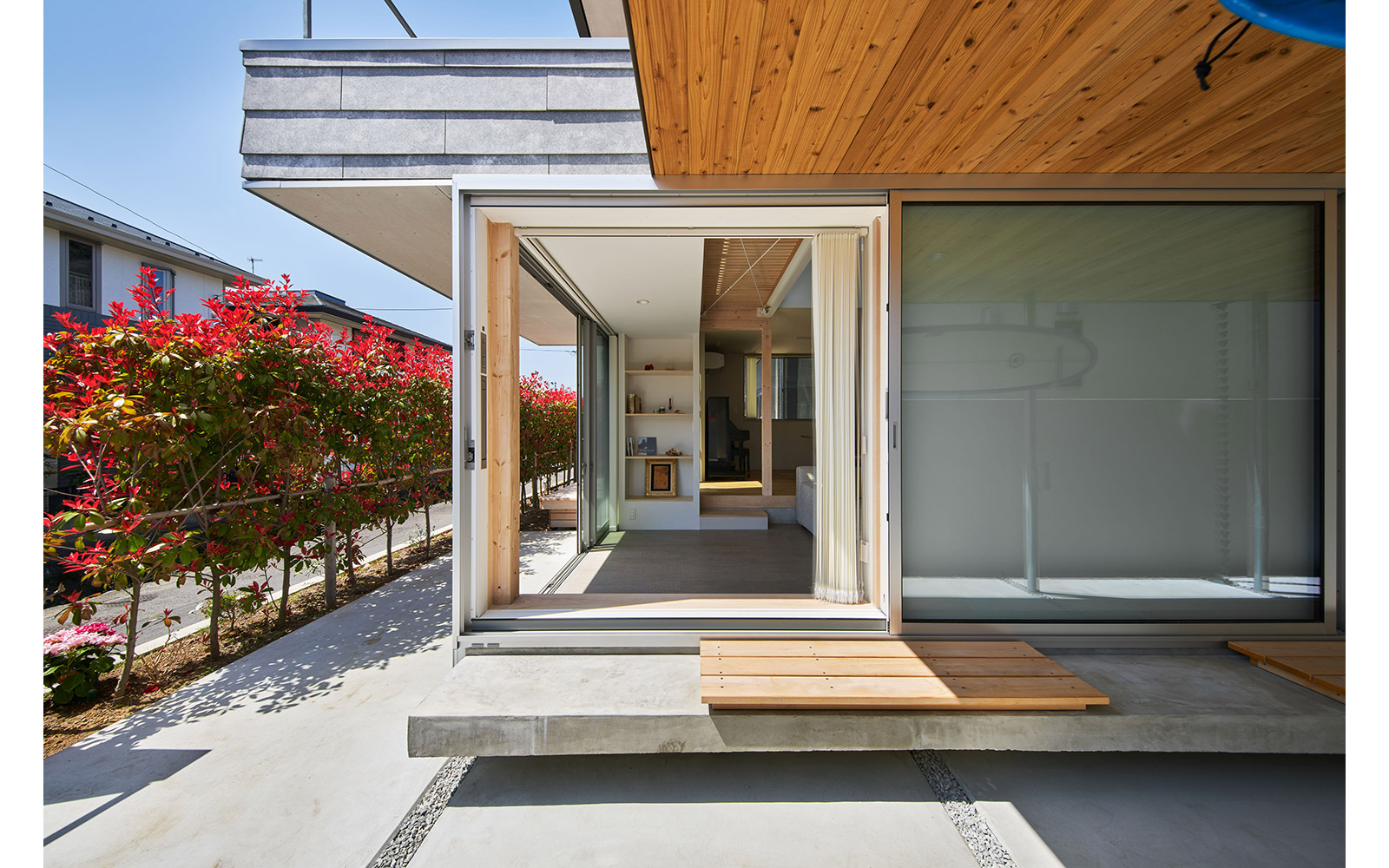 神奈川県鎌倉市の海の近くに建つ夫婦と子供のための住宅。敷地は閑静な住宅街に造成された大型分譲地内にあり、位置指定道路の終点に位置する一方で、裏手の1m程下段の道路にも接道しているという特徴がある。そこで、敷地の南北を貫通してこれらの2面道路を繋げるような半屋外の空間を「通りdoma」と名付け、そこから連続的に広がる室内空間を設けることによって、住まいと環境の心地よい関係性を模索した。