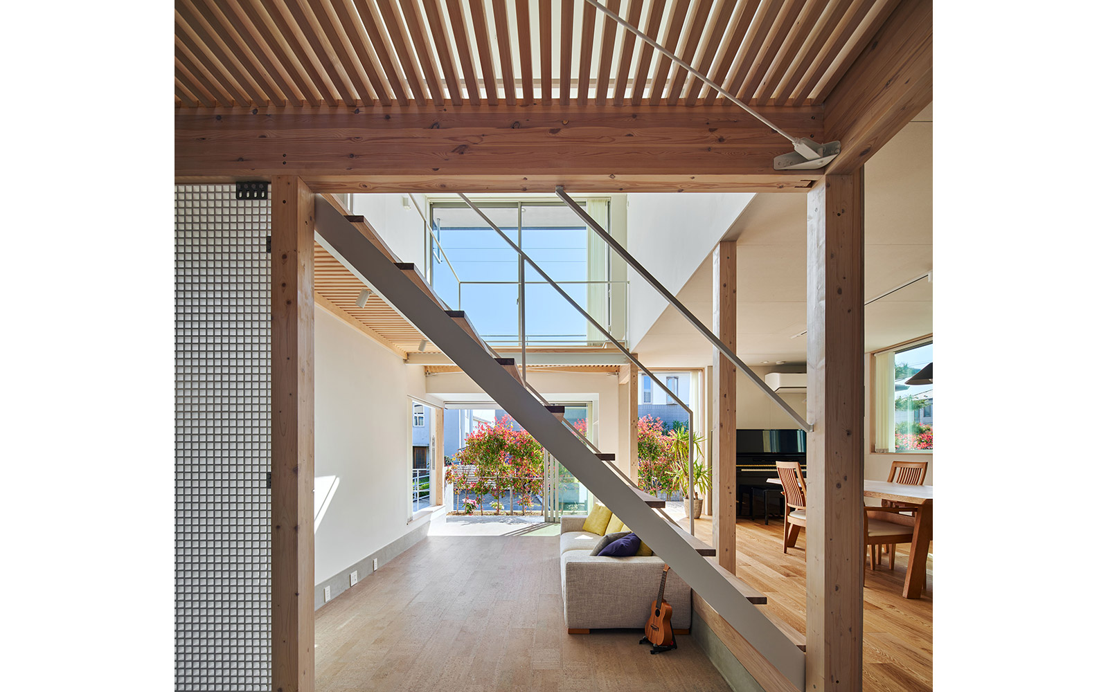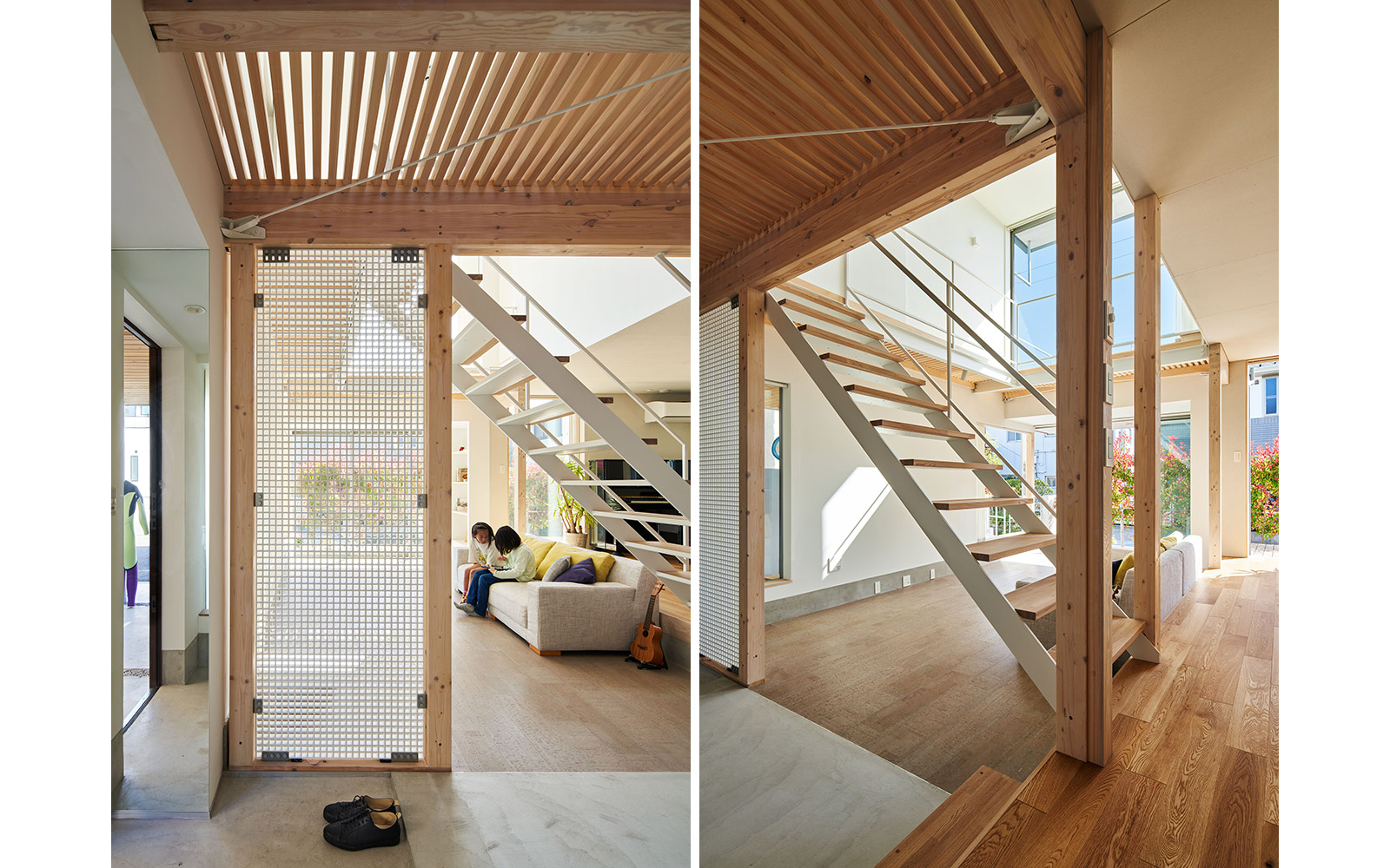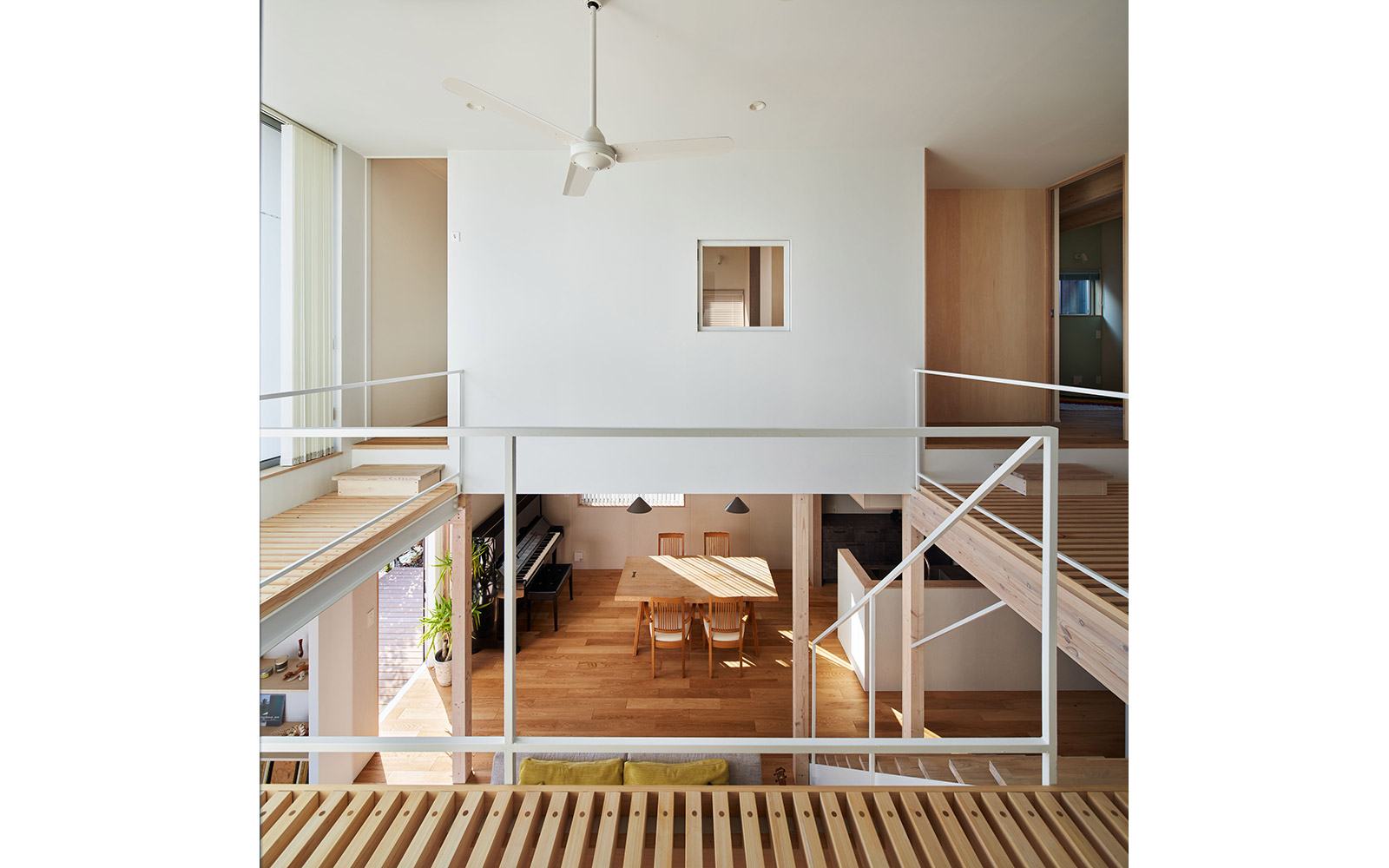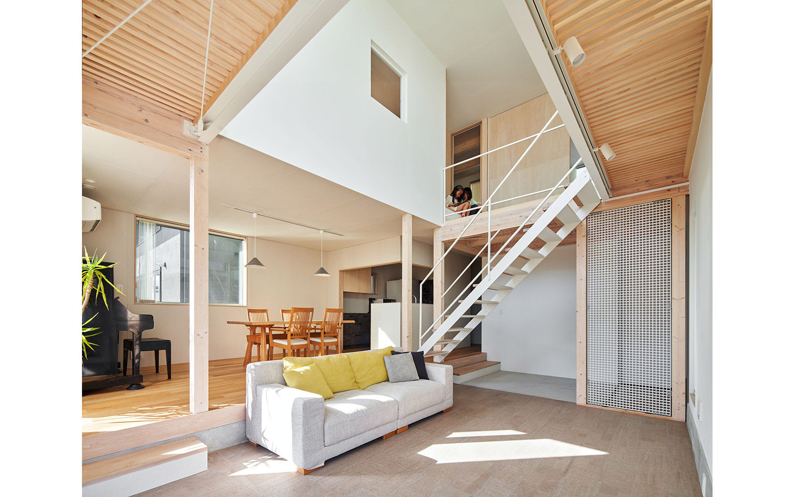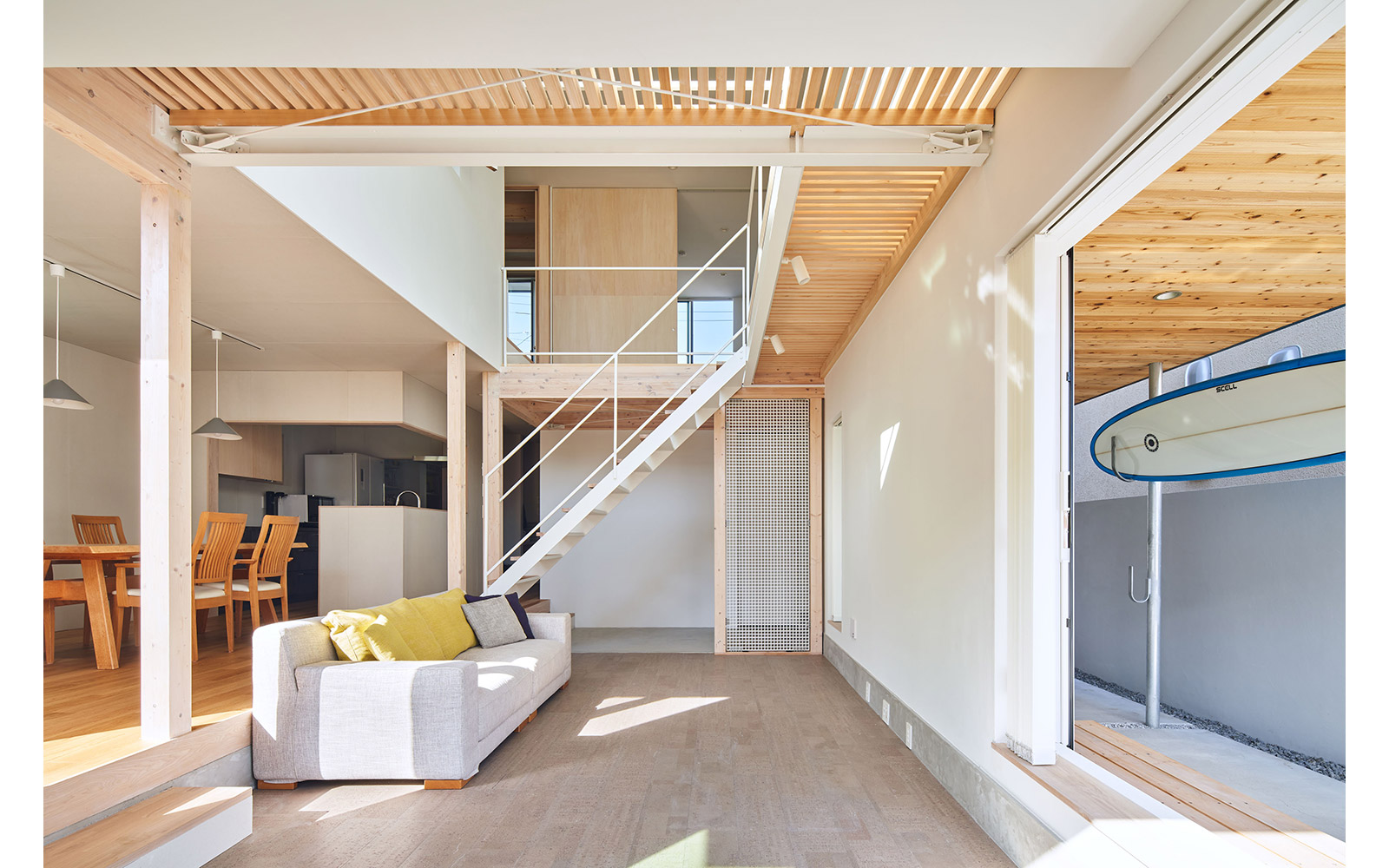 さらに、空間の境界を構成する壁や床には内窓や格子、スノコといった大小様々な形状の孔をあけることによって、多孔質なレイヤーをつくり出した。このことによって家族の気配やアクティビティに加え、光・風といった環境的な要素を建物の内外を行き交わせることを狙っている。