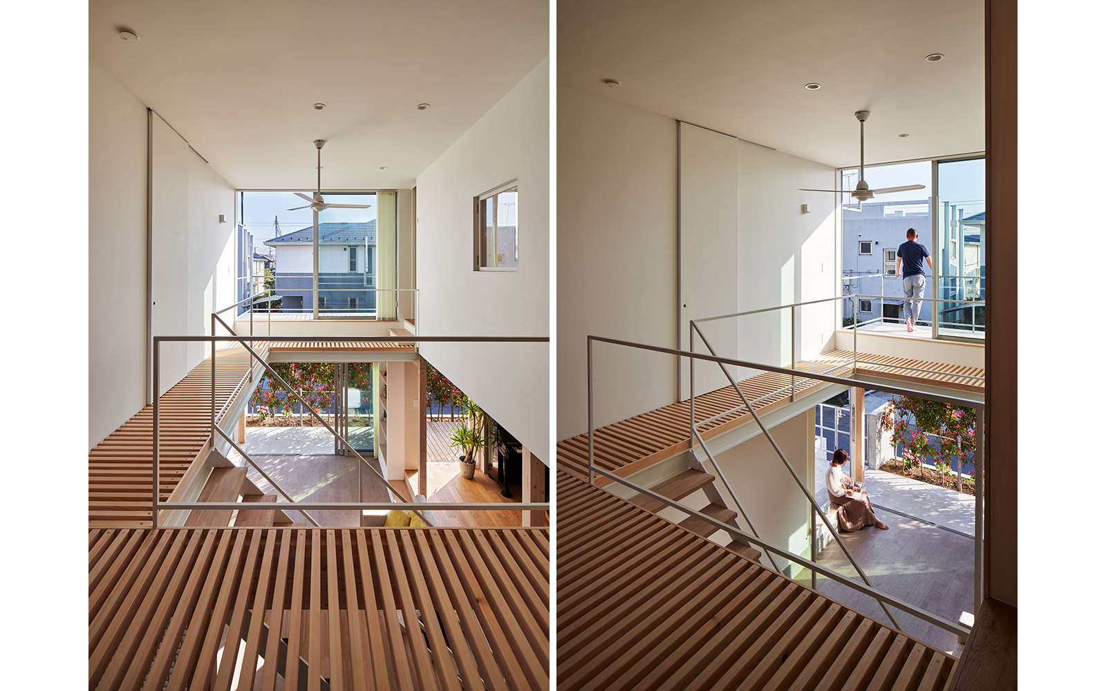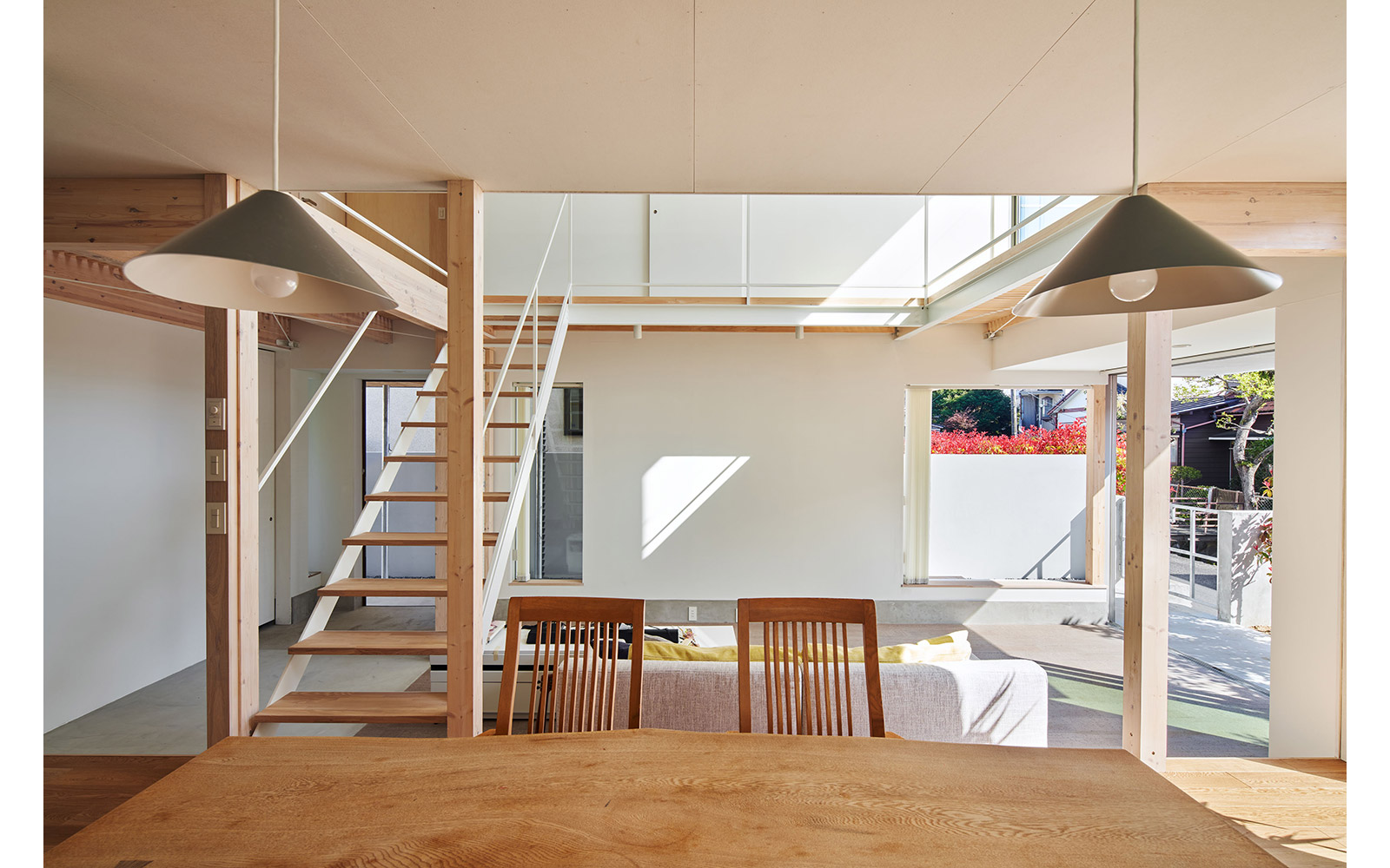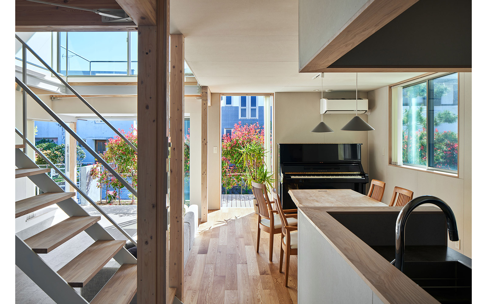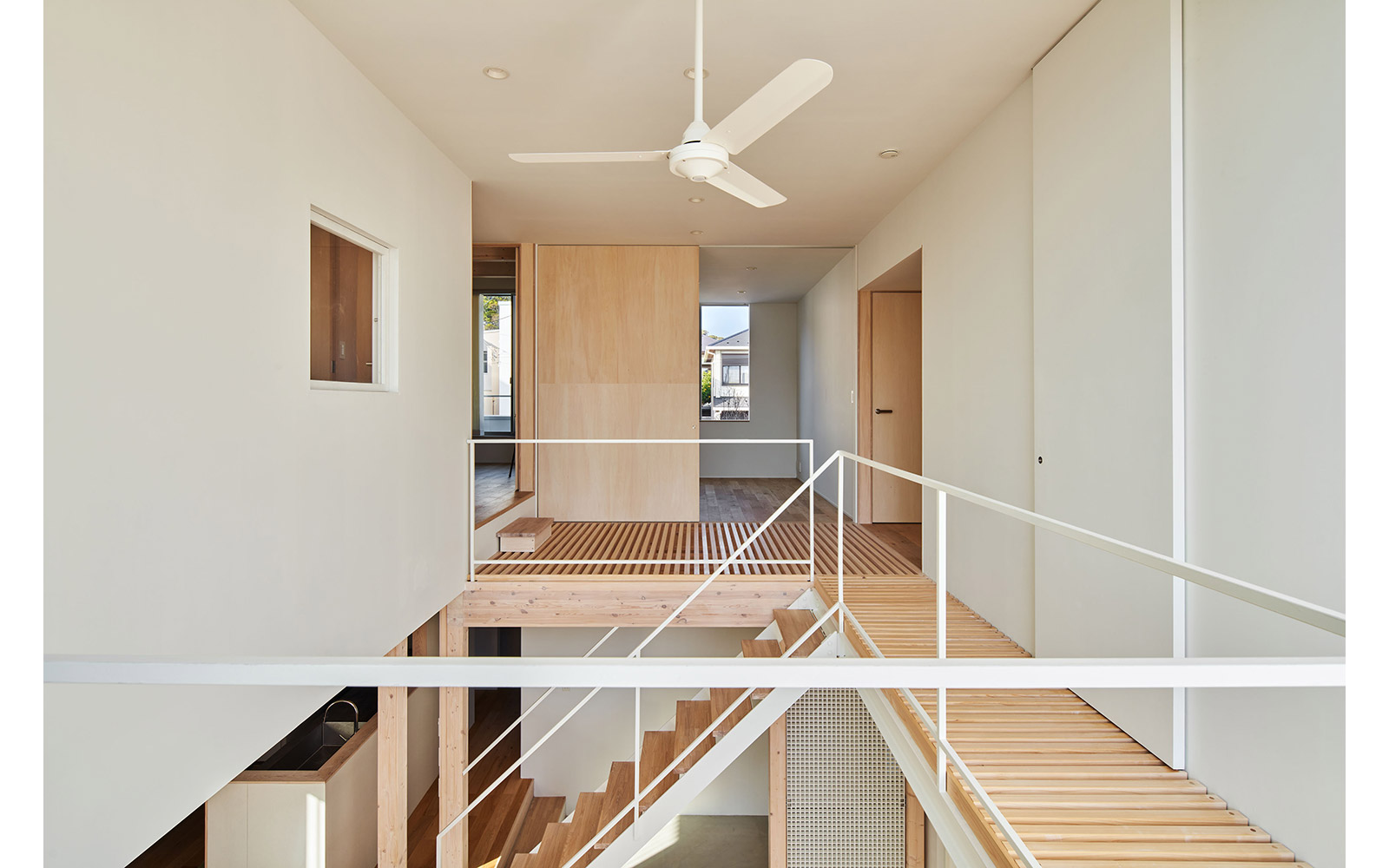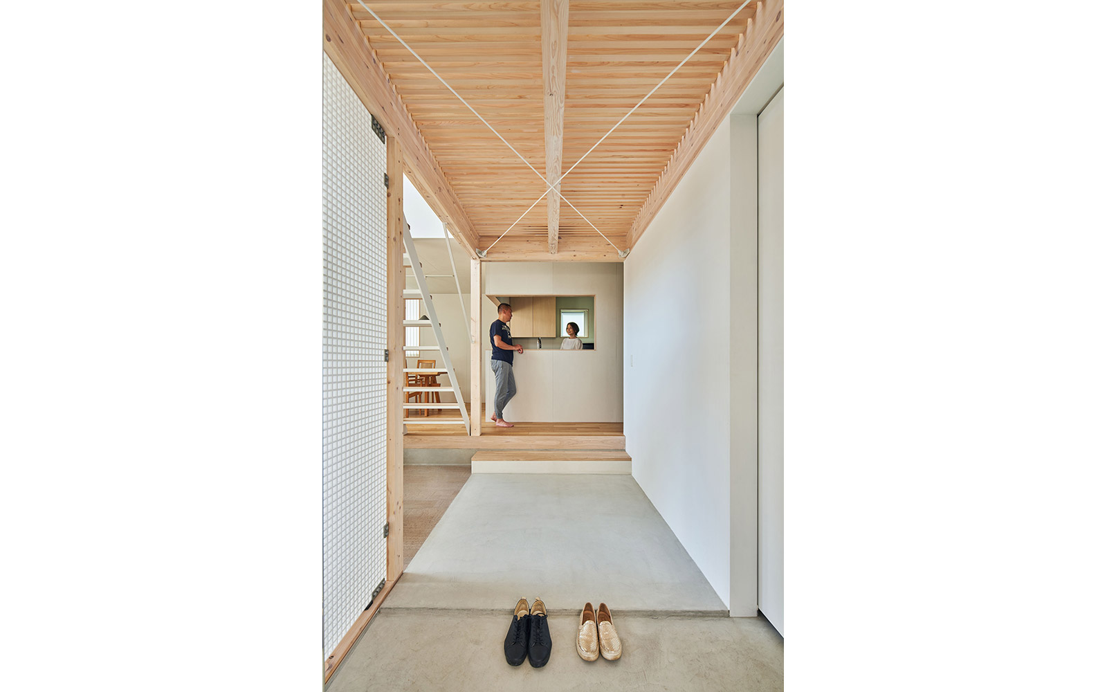 さらに、空間の境界を構成する壁や床には内窓や格子、スノコといった大小様々な形状の孔をあけることによって、多孔質なレイヤーをつくり出した。このことによって家族の気配やアクティビティに加え、光・風といった環境的な要素を建物の内外を行き交わせることを狙っている。