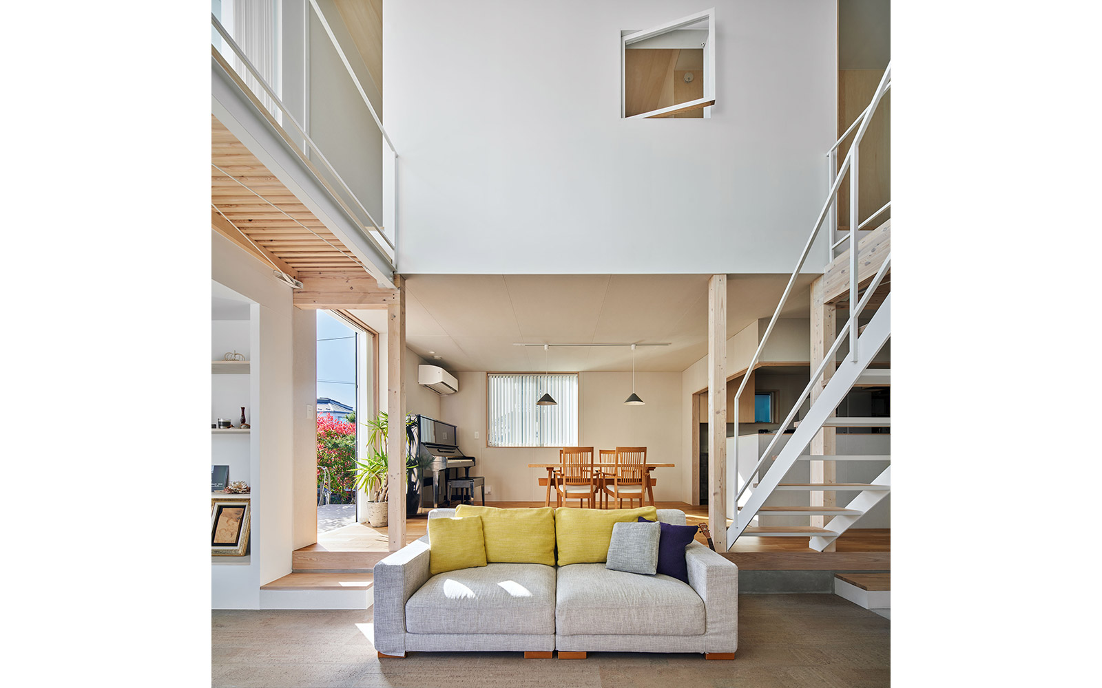 平面的には1Fに通り土間doma・吹抜けのリビング・ダイニングキッチンという東西方向の帯状の3層構成とし、2Fには居室と水回りをまとめ、回遊性のある動線を複数設けている。断面的には各階の床レベルを30cmスキップさせ、天井高さにも変化をつけることによって立体的なシークエンスを生み出している。