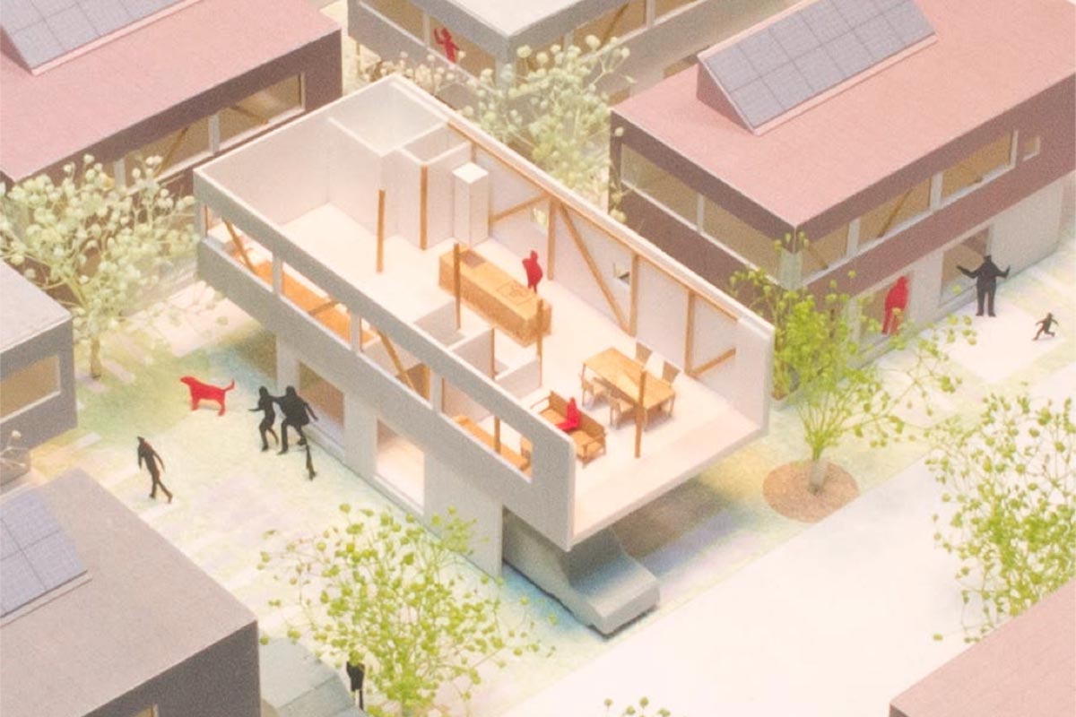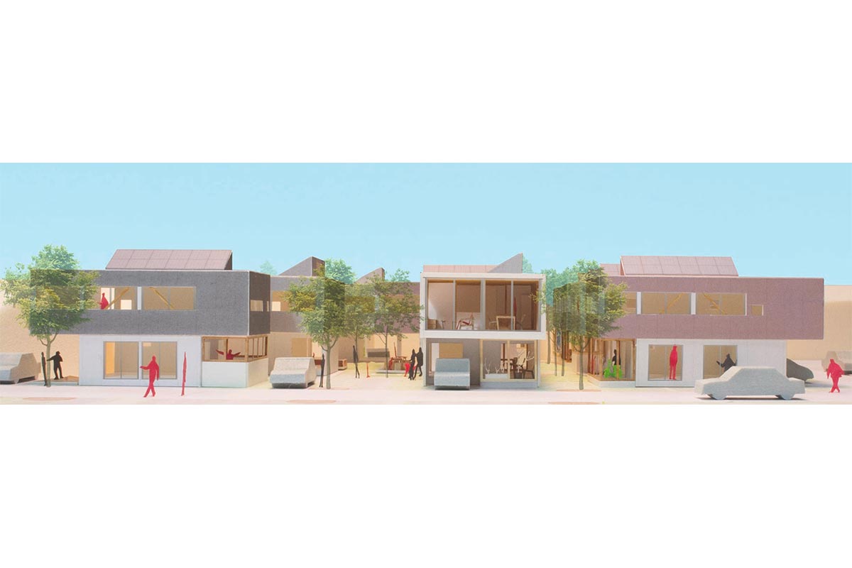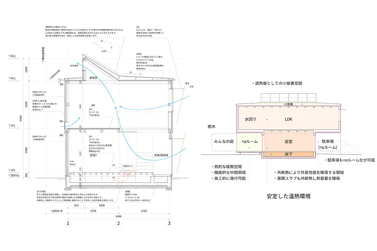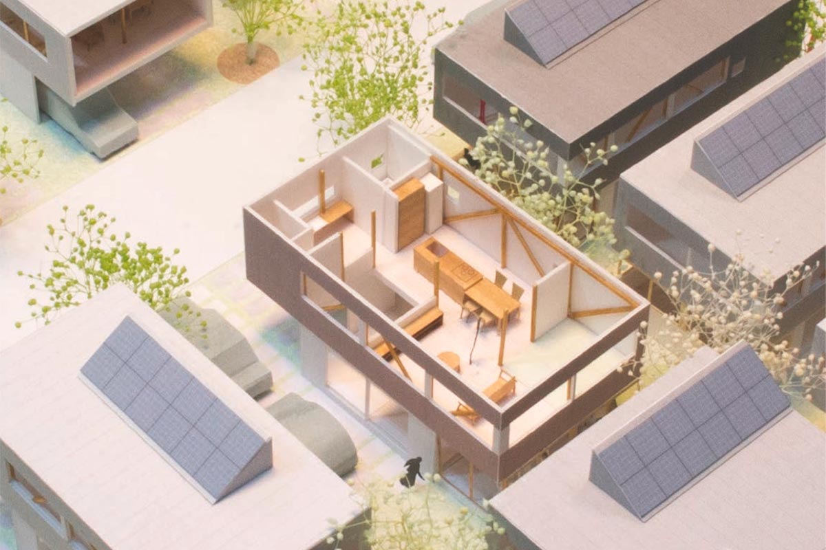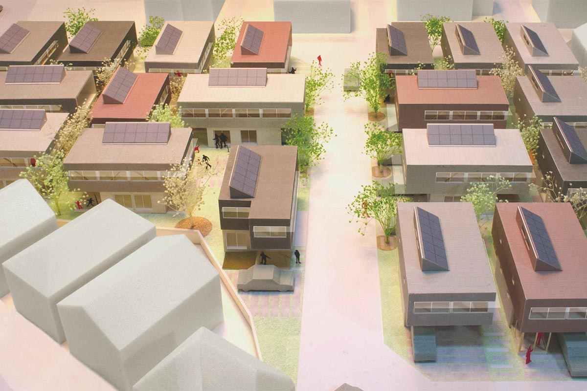 戸建住宅それぞれを単体で考えるのではなく、20戸の戸建集合住宅郡とみなすことで、住宅間の環境や敷地全体を総合的をデザインすることを心がけた。敷地境界線の塀をなくし住人が共同で管理する「みんなの木」を植え、 また住人が自分でカスタマイズできる中間領域をそれぞれの各住宅に設けることによって、 明確な境界ではなくプライベートとパブリックを住人が選べるような曖昧な境界(共界)をつくりだしている。