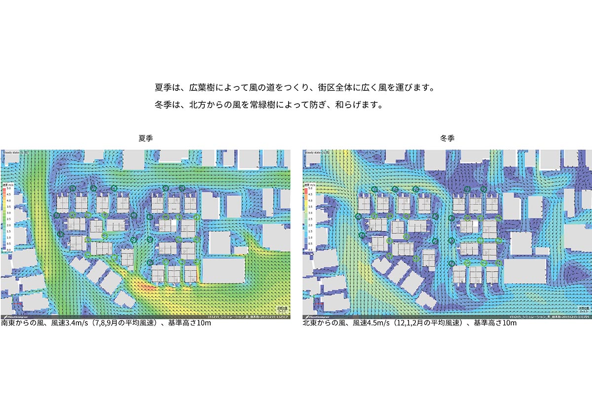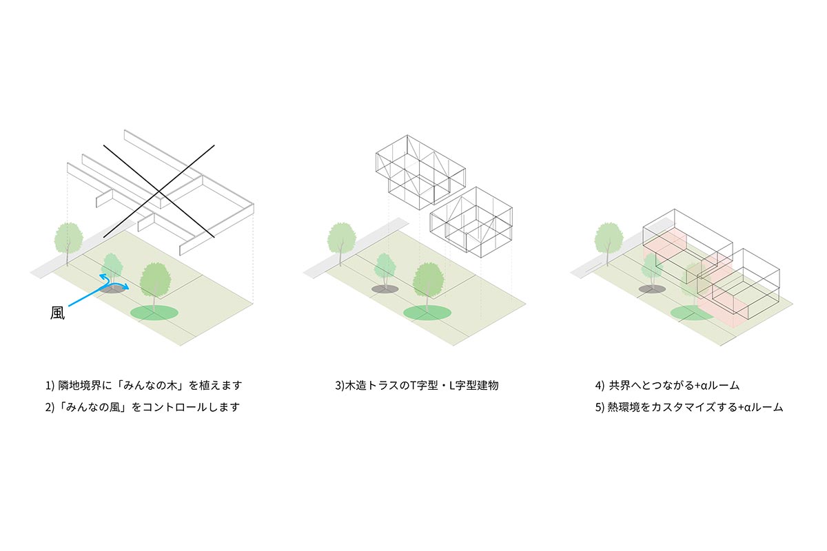 「みんなの木」は隣接する住宅の共用の広場となったり、住宅間の視線の調整、 共界へ流れる「みんなの風」をコントロールする役割を担っている。このような(共界)を敷地全体で協力してつくっていくことで、この街に豊かな風景が生まれ、コミュニティが成熟することを目指している。